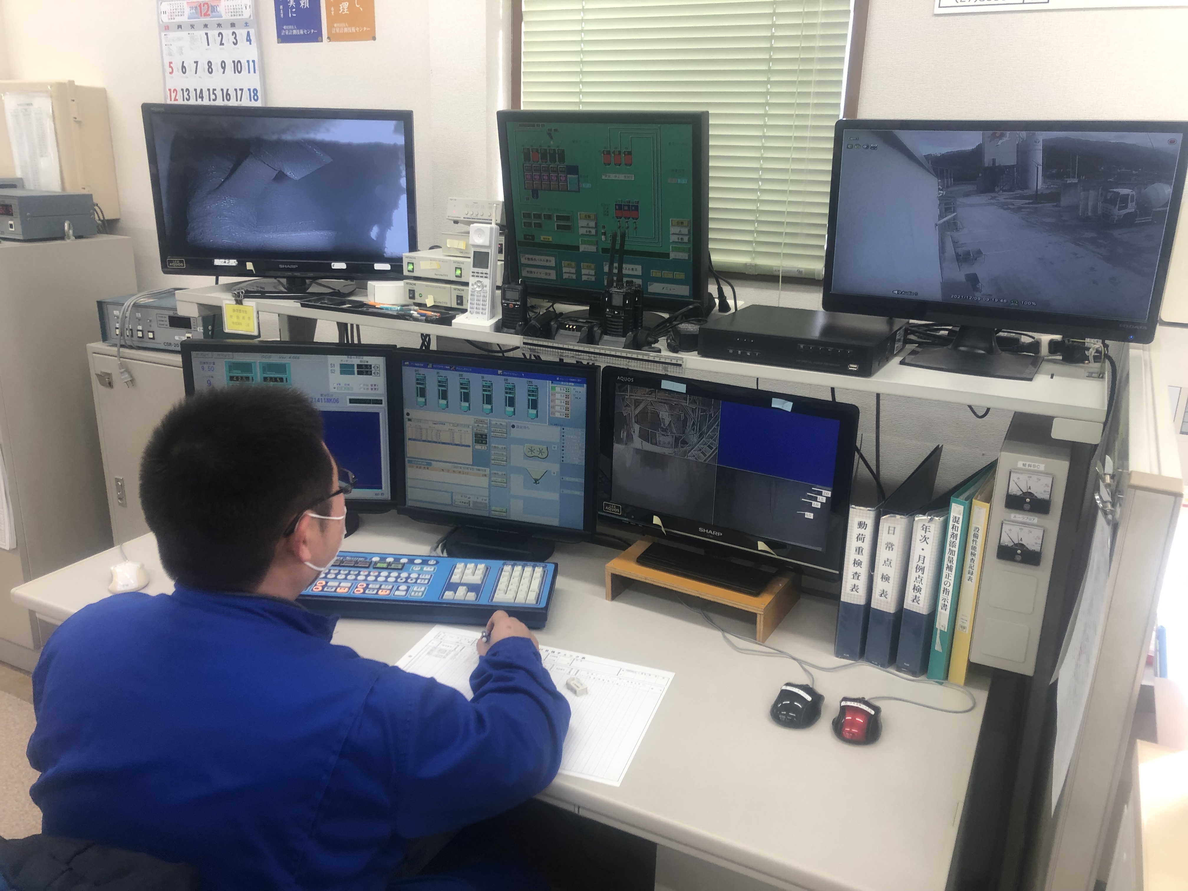 ⽣コンの製造は、 定められた配合にしたがって、良質のセメント、砂、砕⽯、混和剤を計量器で計量し、 ミキサで練り混ぜます。製造係は、⽣コンが正常に造られているかや、プラント機器に異常がないか を計器や各種モニタで監視します。常に⾼品質の安定した⽣コンの製造に努めています。